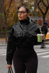 The Highline Bomber Jacket reimagines a classic silhouette with modern refinement. Crafted from supple faux leather, this cropped style features a commanding high collar that frames the neckline with understated sophistication. The structured fit delivers a polished aesthetic perfect for layering over essentials or pairing with tailored pieces. A versatile wardrobe essential that transitions seamlessly from day to evening, this bomber balances edgy attitude with refined sophistication.
