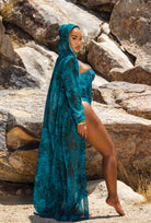 Drape yourself in luxury with our Gaia Hooded Cover Up in Aqua Snake. Made from sheer chiffon, this piece exudes goddess-like beauty with its hooded design. Elevate your poolside style and embrace your inner goddess with this elegant and exclusive cover up.