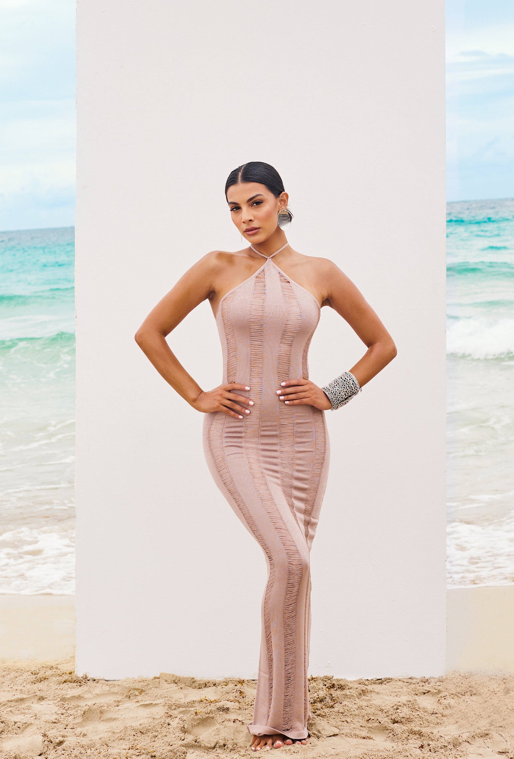 Introducing the Matte Resort Alexandra Dress. This dress features a halter style top, bodycon fit, and stretchy knitted fabric with a laddered shred detail. For the beach or out to dinner, Alexandra is a must-have.