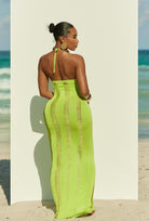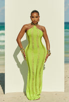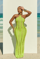 Introducing the Matte Resort Alexandra Dress. This dress features a halter style top, bodycon fit, and stretchy knitted fabric with a laddered shred detail. For the beach or out to dinner, Alexandra is a must-have.